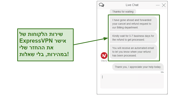 אתם יכולים לנסות את פיצ'רי האבטחה של ExpressVPN ללא סיכון בזכות ההתחייבות שלו להחזר כספי למשך 30 יום. תוכלו לבקש החזר כספי בקלות דרך הדוא"ל או הצ'ט החי בלי שאלות! אני ניסיתי זאת בעצמי והיה לי קל מאוד לקבל את הכסף שלי בחזרה.